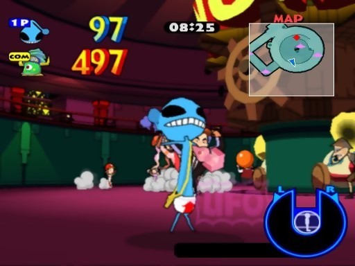 Ce n’est pas le tout de faire mu-muse avec l’ADN mais il faut se mettre au boulot. Récupérer un maximum de pièces est un vrai challenge. Vous devez agacer les humains pour que ces derniers fassent tomber l’argent de leur poche. Vous avez à votre disposition des dizaines et des dizaines d’objets afin de les rendre furibonds. Ça peut aller des simples punaises insidieusement placées sur la chaussée à la tarte à la crème en pleine figure façon Noël Godin. Le jeu se veut avant tout loufoque et petit à petit vous allez découvrir des objets délirants à la portée de plus en plus grande. Voici une liste non exhaustive de votre arsenal : hamburger géant, gant de boxe, feu d’artifice, troupeau d’éléphant, tank, bazooka, chiens de cirque, requins, boules de bowling, bombe etc. Les Terriens vont en voir de toutes les couleurs. Ecrasés, brûlés, électrocutés, peu après votre exploit, ils vous auront dans le collimateur. Et c’est à ce moment-là qu’il faudra changer de peau afin de leurrer vos poursuivants car s’ils vous choppent vous allez passer un sale quart d’heure. Au bout de deux arrestations, vous redeviendrez un alien aux yeux de tous et votre pactole se verra amputer de quelques pièces. Préférez la fuite après avoir récolté votre butin pour ne pas subir les foudres des humains. Pour amasser un maximum d’argent, il existe une période appelée « panique » durant laquelle vous êtes plus vulnérable mais où l’or tombe en abondance. Selon les niveaux, il faudra prendre certaines précautions : évitez tel ou tel personnage, ressembler à un pirate ou jouer sans radar.