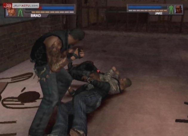 Ces derniers disposent à ce propos d’une palette de coups qui se rapproche des attaques dont dispose Brad et affichent également une barre d’énergie assez conséquente, qui permet de renseigner le joueur sur l’état de santé de ses antagonistes. Très vite, on se rend compte que les ennemis sont coriaces et qu’ils aiment travailler en tandem pour infliger un maximum de dégâts. Certains n’hésiteront pas d’ailleurs à nous reprendre de volée pendant qu’on s’occupe difficilement de l’un de ses copains. La reprise de volée est d’ailleurs l’une des spécialités de Urban Reign qui n’est pas sans rappeler Tekken avec ses enchaînements interminables qui ne donnent même le temps à un combattant de toucher le sol et se défaire d’une série de combos. On retrouve donc le même principe dans Urban Reign qui s’applique aussi bien du côté du joueur que des ennemis contrôlés par le CPU, qui n’hésite d’ailleurs pas à user de cette technique pour achever Brad définitivement. C’est d’autant plus frustrant que notre pugiliste a tendance à tomber les pommes assez facilement, faisant de lui une cible parfaite pour se prendre une série de mandales et ne plus jamais se relever par la suite.