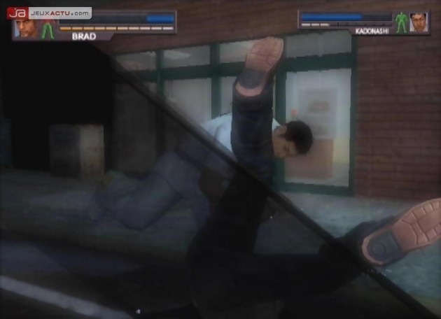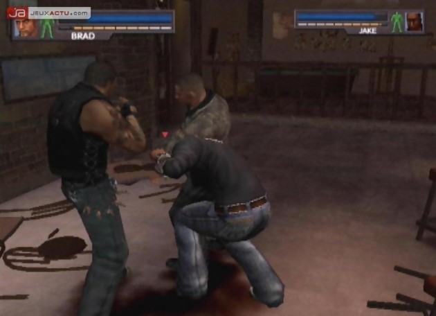 Ces derniers disposent à ce propos d’une palette de coups qui se rapproche des attaques dont dispose Brad et affichent également une barre d’énergie assez conséquente, qui permet de renseigner le joueur sur l’état de santé de ses antagonistes. Très vite, on se rend compte que les ennemis sont coriaces et qu’ils aiment travailler en tandem pour infliger un maximum de dégâts. Certains n’hésiteront pas d’ailleurs à nous reprendre de volée pendant qu’on s’occupe difficilement de l’un de ses copains. La reprise de volée est d’ailleurs l’une des spécialités de Urban Reign qui n’est pas sans rappeler Tekken avec ses enchaînements interminables qui ne donnent même le temps à un combattant de toucher le sol et se défaire d’une série de combos. On retrouve donc le même principe dans Urban Reign qui s’applique aussi bien du côté du joueur que des ennemis contrôlés par le CPU, qui n’hésite d’ailleurs pas à user de cette technique pour achever Brad définitivement. C’est d’autant plus frustrant que notre pugiliste a tendance à tomber les pommes assez facilement, faisant de lui une cible parfaite pour se prendre une série de mandales et ne plus jamais se relever par la suite.