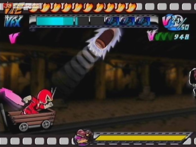 On comprend très vite que Viewtiful Joe est un soft archi léché dans sa conception artistique. Evoluant dans des décors en carton pâte au scrolling unilatéral (comprenez que vous évoluez basiquement sur une ligne de gauche à droite), le héros en collants retourne au charbon pour évoluer entre différentes pellicules afin de stopper l’avancée du Black Emperor qui, figurez-vous, veut carrément réunir les 7 Oscars pour obtenir le pouvoir du Happy End ! Etonnant, non ? Mais pas question de se la jouer solo cette fois ; ex-potiche et petite amie du premier épisode, Sylvia devient jouable pour tenter d’amener un peu de variété à un concept qui n’a pas bougé d’un pouce. Toutefois, pas de mésentente, Viewtiful Joe 2 ne recèle aucun mode deux joueurs, l’amant et l’amante sont interchangeables par une simple pression du bouton R2 (Z sur Game Cube), et comme vous vous en doutez certainement, disposent de capacités qui leur sont propres.
