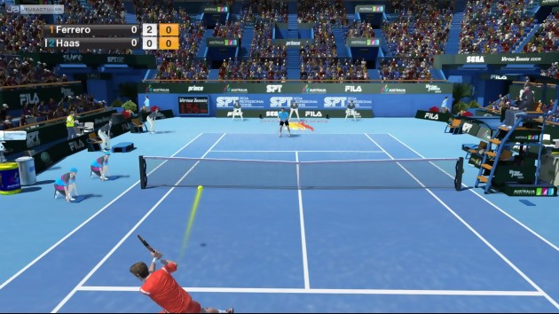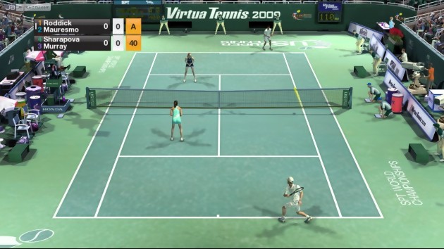 Cela se ressent immédiatement en termes de réalisation qui, à notre grand désarroi, n’a pas changé depuis la sortie de Virtua Tennis 3. Le soft n’en demeure pas moins agréable à regarder, mais dans un secteur où l’évolution graphique est une priorité, on se demande si les concepteurs ne se sont pas volontairement tirés une balle dans le pied. Car si les graphismes de Virtua Tennis 2009 ne choquent pas dans leur ensemble, une fois qu’on commence à entrer dans les détails, c’est une autre paire de manche. La modélisation hasardeuse des joueurs par exemple ne peut plus faire illusion. A l’exception peut-être d’un Juan Carlos Ferrero et d’un Novak Djokovic potables, les autres personnages du jeu ont été sacrément bâclés. Il suffit de jeter un œil au rendu 3D de Rafael Nadal, Tommy Haas ou bien encore Ana Ivanovic pour se rendre compte à quel point ils ne ressemblent à rien. Et pour peu qu’ils soient crapuleux, nos stars de la raquette pourraient exiger un dédommagement pour un travail aussi lamentable. Cela serait une goutte d’eau dans un océan si le reste des graphismes étaient réussis, mais il n’en est rien. L’ensemble des personnages ont en effet conservé l’aspect poupée de cire que pouvaient avoir les premiers jeux au moment de l’arrivée de la HD, figeant totalement leurs tenues vestimentaires qui arborent les mêmes plissures quelque soient les mouvements. Quant à l’animation, elle manquait déjà de souplesse dans Virtua Tennis 3 et accuse aujourd’hui le poids des années puisqu’aucun changement notoire n’a été effectué. Toujours parmi les défauts de cette cuvée 2009, on notera l’absence d’ambiance sur les courts, la faute à un public peu réactif, et qui n’applaudit vraiment qu’au dénouement d’un échange épique. Ce dernier a tendance à somnoler dans son coin et l’on conseille vivement à Sumo Digital de s’inspirer de la série NBA 2K pour gagner en galon. Aussi, pour masquer cette somnolence permanente, les développeurs ont opté pour une bande-son proéminente, faite de musiques d’ascenseur qui aura vite fait de nous casser les tympans. Cette musique insupportable est inhérente à la série a-t-on l’impression, puisque depuis les débuts de la franchise en Arcade, il semblerait que ce soit le même compositeur qui soit toujours à l’œuvre. A notre humble avis, il serait temps de s’en débarrasser…