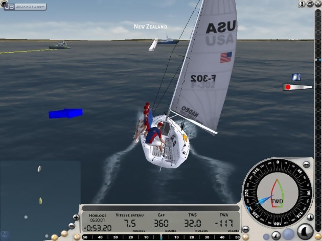 Les passionnés de voiles ne sont pas légions dans notre pays ou tout au moins nous pourrons dire que ce sport reste assez méconnu du grand public. Aussi, les néophytes peuvent légitimement se demander si un tel titre pourrait leur convenir et s’il ne serait pas trop technique. Mais que l’on se rassure, Virtual Skipper 5 répond aux attentes de tout le monde. Les puristes pourront configurer leur partie de manière à respecter scrupuleusement les règles de l’ISAF et ne naviguer qu’à l’aide des instruments de bord. A l’inverse, les novices bénéficient d’une foulée d’indicateurs en tous genres pour les épauler dans leur navigation : flèche directionnelle du vent, affichage des marques du parcours et des laylines, etc. Les parties sont d’ailleurs un peu plus accessibles dans ce sens et un tutorial complet permet de s’initier aux subtilités de la pratique de la voile : apprendre à se placer par rapport au vent ou jouer sur les différentes voiles (foc, spi, etc.) pour gagner de précieuses secondes, négocier correctement un virage ou bien encore assimiler les dissemblances comportementales qui existent entre les différents types de navires disponibles. Conforté par le succès de Trackmania, Nadéo y applique le même community model. L’éditeur permet de créer très simplement ses propres parcours et les modeleurs en herbe pourront importer leur création dans le jeu et ainsi enrichir le nombre de navires disponibles. Si le mode en ligne décuplait la saveur particulière de Virtual Skipper 4, ce nouvel opus le met davantage en avant en adoptant un système de ladder identique à celui de Trackmania United. Autrement dit, il faut arriver à accéder dans le haut du classement de son département pour se hisser dans la compétition régionale, puis nationale et internationale. Côté réalisation, on ne trouve presque rien à redire. Les bateaux sont modélisés avec soin et la réalisation de l’eau flatte sérieusement la rétine. On regrettera un peu que les rivages des plans d’eaux soient un peu aliasés mais ce n’est pas le plus important. Niveau durée de vie, on ne peut pas non plus s’en plaindre. En sus du furieux mode en ligne, il est possible de participer à des courses simples, des coupes fictives et bien entendu de disputer la 32ème Coupe de l’America. On pouvait reprocher auparavant à Virtual Skipper de ne pas proposer de véritable challenge pour le joueur en solo. Cette compétition comble donc cette lacune avec brio. Comme dans la réalité, il faudra d’abord se qualifier pour les demi-finales via la Louis Vuitton Cup pour ensuite affronter les vainqueurs de la session précédente : Alinghi. Le niveau est assez relevé car chaque erreur se paye au comptant : les petits tricheurs adeptes de l’option "recommencer" ou de la sauvegarde sont invités à passer leur chemin.