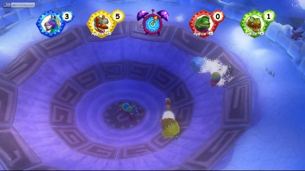 Les fans de l’univers Viva Piñata seront ravis de retrouver leurs bestioles favorites, d’Isidore Canasucre à Eric Mélisson en passant par Freddy Goupimiel, Boubou Guimours et leur double au féminin. Huit personnages qui, malgré leur corpulence différente, n’ont quasiment aucun point fort ou point faible dans le jeu à la différence d’un Mario Party. Par conséquent, le choix de votre avatar importe peu et c’est également dans cette optique que l’on enchaîne un à un les défis entrecoupés de courses (à pieds) façon Mario Kart. Car si les développeurs de Krome Studios ont chercher à créer des challenges inédits, ils ont fait l’impasse sur un quelconque scénario. Voilà qui fait tâche face à l’adaptation Xbox 360 de Rayman contre les Lapins Crétins et même face au mauvais Fuzion Frenzy 2. Pour se consoler, on se dira que Viva Piñata : Party Animals contient une cinquantaine de mini-jeux. Chouette !. Le jeu se découpe en plusieurs manches avec pour chacune des manches une course et deux épreuves opposant quatre concurrents, humains ou contrôlés par l’ordinateur. Concernant les courses, hormis le fait qu’elles se déroulent à pieds (ou plutôt à pattes), elles ressemblent comme deux gouttes d’eau à ce que l’on peut trouver dans Mario Kart : raccourcis, zone de boost, power-up… Le but du jeu, vous vous en doutez, consiste à franchir la ligne d’arrivée avant les piñatas concurrentes en usant de tous les stratagèmes possibles et inimaginables. Dégainer un missile fiesta pour faire la fête au postérieur de votre adversaire, renverser du miel sur la chaussée  ou augmenter sa vitesse à l’aide du jetpack, tous les coups sont permis et les autres challengers ne se gêneront pas pour vous mettre des bâtons dans les roues. Amusant les quelques premières fois, les courses deviennent vite rébarbatives à cause des tracés beaucoup trop classiques et un manque d’idée dans leur design. Certes, elles reprennent l’univers colorés de Viva Piñata. Mais ce n’est pas assez pour renouveler le plaisir de s’aligner sur la grille de départ. De plus, et là je me retourne vers les joueurs qui n’ont pas d’amis et qui n’ont pas accès au Xbox Live, le titre reste très facile sûrement pour ne pas dérouter les jeunes gamers mais un peu de piquant n’aurait pas fait de mal au replay-value du soft.