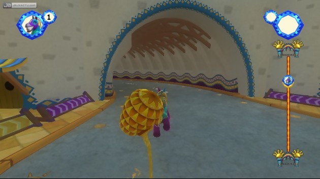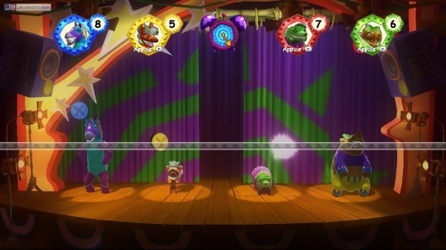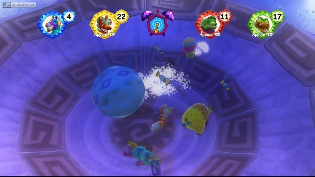 Les fans de l’univers Viva Piñata seront ravis de retrouver leurs bestioles favorites, d’Isidore Canasucre à Eric Mélisson en passant par Freddy Goupimiel, Boubou Guimours et leur double au féminin. Huit personnages qui, malgré leur corpulence différente, n’ont quasiment aucun point fort ou point faible dans le jeu à la différence d’un Mario Party. Par conséquent, le choix de votre avatar importe peu et c’est également dans cette optique que l’on enchaîne un à un les défis entrecoupés de courses (à pieds) façon Mario Kart. Car si les développeurs de Krome Studios ont chercher à créer des challenges inédits, ils ont fait l’impasse sur un quelconque scénario. Voilà qui fait tâche face à l’adaptation Xbox 360 de Rayman contre les Lapins Crétins et même face au mauvais Fuzion Frenzy 2. Pour se consoler, on se dira que Viva Piñata : Party Animals contient une cinquantaine de mini-jeux. Chouette !. Le jeu se découpe en plusieurs manches avec pour chacune des manches une course et deux épreuves opposant quatre concurrents, humains ou contrôlés par l’ordinateur. Concernant les courses, hormis le fait qu’elles se déroulent à pieds (ou plutôt à pattes), elles ressemblent comme deux gouttes d’eau à ce que l’on peut trouver dans Mario Kart : raccourcis, zone de boost, power-up… Le but du jeu, vous vous en doutez, consiste à franchir la ligne d’arrivée avant les piñatas concurrentes en usant de tous les stratagèmes possibles et inimaginables. Dégainer un missile fiesta pour faire la fête au postérieur de votre adversaire, renverser du miel sur la chaussée ou augmenter sa vitesse à l’aide du jetpack, tous les coups sont permis et les autres challengers ne se gêneront pas pour vous mettre des bâtons dans les roues. Amusant les quelques premières fois, les courses deviennent vite rébarbatives à cause des tracés beaucoup trop classiques et un manque d’idée dans leur design. Certes, elles reprennent l’univers colorés de Viva Piñata. Mais ce n’est pas assez pour renouveler le plaisir de s’aligner sur la grille de départ. De plus, et là je me retourne vers les joueurs qui n’ont pas d’amis et qui n’ont pas accès au Xbox Live, le titre reste très facile sûrement pour ne pas dérouter les jeunes gamers mais un peu de piquant n’aurait pas fait de mal au replay-value du soft.