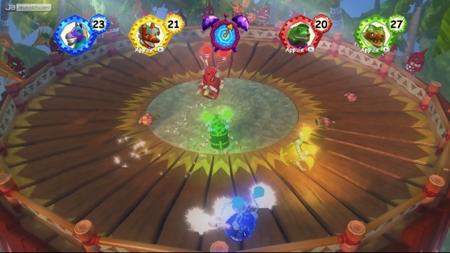 Les fans de l’univers Viva Piñata seront ravis de retrouver leurs bestioles favorites, d’Isidore Canasucre à Eric Mélisson en passant par Freddy Goupimiel, Boubou Guimours et leur double au féminin. Huit personnages qui, malgré leur corpulence différente, n’ont quasiment aucun point fort ou point faible dans le jeu à la différence d’un Mario Party. Par conséquent, le choix de votre avatar importe peu et c’est également dans cette optique que l’on enchaîne un à un les défis entrecoupés de courses (à pieds) façon Mario Kart. Car si les développeurs de Krome Studios ont chercher à créer des challenges inédits, ils ont fait l’impasse sur un quelconque scénario. Voilà qui fait tâche face à l’adaptation Xbox 360 de Rayman contre les Lapins Crétins et même face au mauvais Fuzion Frenzy 2. Pour se consoler, on se dira que Viva Piñata : Party Animals contient une cinquantaine de mini-jeux. Chouette !. Le jeu se découpe en plusieurs manches avec pour chacune des manches une course et deux épreuves opposant quatre concurrents, humains ou contrôlés par l’ordinateur. Concernant les courses, hormis le fait qu’elles se déroulent à pieds (ou plutôt à pattes), elles ressemblent comme deux gouttes d’eau à ce que l’on peut trouver dans Mario Kart : raccourcis, zone de boost, power-up… Le but du jeu, vous vous en doutez, consiste à franchir la ligne d’arrivée avant les piñatas concurrentes en usant de tous les stratagèmes possibles et inimaginables. Dégainer un missile fiesta pour faire la fête au postérieur de votre adversaire, renverser du miel sur la chaussée  ou augmenter sa vitesse à l’aide du jetpack, tous les coups sont permis et les autres challengers ne se gêneront pas pour vous mettre des bâtons dans les roues. Amusant les quelques premières fois, les courses deviennent vite rébarbatives à cause des tracés beaucoup trop classiques et un manque d’idée dans leur design. Certes, elles reprennent l’univers colorés de Viva Piñata. Mais ce n’est pas assez pour renouveler le plaisir de s’aligner sur la grille de départ. De plus, et là je me retourne vers les joueurs qui n’ont pas d’amis et qui n’ont pas accès au Xbox Live, le titre reste très facile sûrement pour ne pas dérouter les jeunes gamers mais un peu de piquant n’aurait pas fait de mal au replay-value du soft.