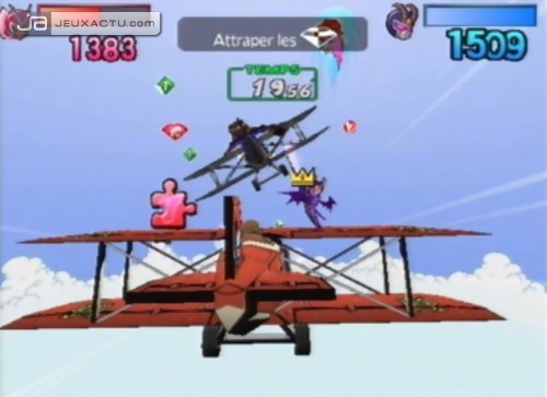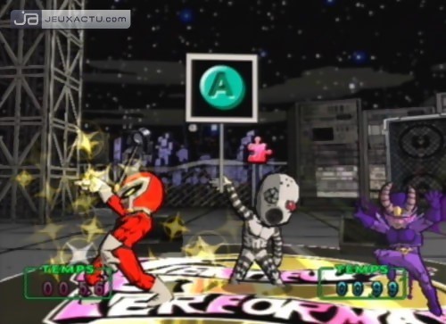 Lorsque l'on a passé des nuits entières sur Super Smash Bros. Melee, il est difficile de ne pas avoir un minimum d'exigeance en terme de gameplay. A notre goût, l'erreur fatale commise par Clover Studio dans la configuration de la manette, c'est le combo stick analogique vers le bas+A (ou +B) pour descendre d'un étage. Peu embêtant durant les premières minutes de jeu, il devient rapidement insupportable dans la récupération d'items et dans certaines missions de jumping. Il aurait été préférable d'utiliser un système de double-pression du stick, beaucoup plus efficace et surtout plus précis. A l'instar du titre de HAL Laboratory, chaque direction donnée au stick conjuguée à B ou Y confère une attaque différente. Du coté des attaques spéciales via X, certaines s'avèrent très efficaces pour atteindre les ennemis grâce à une allonge généreuse. On pense notamment au lightning blade d'Alastor ou au blue thunder de Capitaine Blue. Utilisables à l'infini, ces mouvements spéciaux ont le désavantage de noyer rapidement les combats dans du bourrinage à tout va. Les VFX Powers offrent l'occasion de retrouver quelques plaisirs découverts avec le Viewtiful Joe originel. Le mach speed embrase le joueur, ce qui lui permet d'aller brûler tous les adversaires aux quatre coins de l'écran à la vitesse de la lumière. Le zoom double la taille du joueur, ce qui décuple ses attaques et leur portée; plusieurs ennemis peuvent être touchés avec une seule claque; la classe ! Les sound effects sont sans doute les moins intéressants de la liste. En maintenant L ou R (quatre niveaux de puissance au total), les sons se matérialisent et des blocs sonores plus ou moins gros et plus ou moins puissants sont balancés sur les acteurs adverses. Pour finir, le fameux slow qui ralentit tous les personnages présents à l'écran, ce qui alloue à son propriétaire une priorité absolue sur toutes les attaques. Outre les VFX Powers, les VFX Battles, sorte de mini-jeux dans le combat dans lesquels sont aspirés tous les combattants, pimentent également les parties. A l'image d'un Mario Party, le but de ces affrontements atemporels est de voler le plus d'écus V à l'adversaire. Il en existe plusieurs types : button smash, round & round, timing battle, rallye battle et quick draw. Button smash et round & round s'adresse plutôt aux adeptes de Track & Field puisque l'on doit appuyer le plus rapidement possible sur tous les boutons et faire tournoyer comme un malade les deux sticks de la manette. L'ensemble reste très basique, mais bougrement stressant lorsque l'on a un certain pécule à défendre; surtout dans les épreuves nécessitant un bon timing.