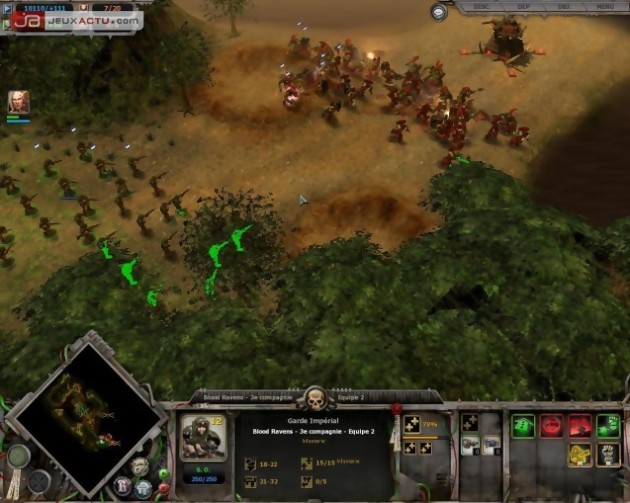 Les unités justement parlons-en ! Elles fonctionnent selon le bon vieux principe de pierre-papier-ciseaux. Aucune unité n’est donc invulnérable mis à part une unité unique sur laquelle je reviendrai plus tard. Ici, toutes les unités piétonnes, les troopers, sont fabriquées en escouade. Et c’est l’une des caractéristiques du jeu là encore. En effet une escouade, même composée de 8 soldats ne peut compter que pour 1 ou 2 hommes dans le compteur des troupes limitées à 20. Ensuite chaque escouade est personnalisable comme dans le jeu de plateau : je rajoute un sergent, je mets une arme lourde à celui-ci (un fuseur), une autre à celui-là (un lance-flammes). Ce sont ces customisations qui donnent tout son sel au jeu car cela permet réellement de renverser une situation, et une escouade en théorie peu encline au combat lourd peut y faire face. On retrouve cette customisation sur certains véhicules, ce qui permet d’obtenir des combinaisons plus efficaces selon l’adversaire. Parmi les unités, certaines ne fonctionnent pas en escouade et sont uniques ou presque sur le terrain : les médics sont produits un à un, les psykers également (troupes disposant de pouvoirs magiques) et surtout les héros sont véritablement uniques. Ces derniers sont, comme dans Warcraft 3, véritablement plus forts et disposent de coups et pouvoirs uniques. Tous ces héros ou unités uniques peuvent être ajoutés à une escouade et font, par la suite, intégralement partie d’elle avec la possibilité de les retirer à tout moment. Cette unité sortant de la sacro règle de pierre-papier-ciseaux et polyvalente, est réellement monstrueuse et l’ennemi aura véritablement du mal à en venir à bout, mais là encore c’est toujours possible. En sus de leurs points de vie, les unités disposent d’une barre de moral. Quand celle-ci atteint un seuil critique (par de lourdes pertes, par l’apparition d’un ennemi imposant), vos troupes se démoralisent et prennent alors la fuite ou encore se mettent à tirer de manière complètement aléatoire et assez inefficace. Pour palier à ce genre de problème, un sergent dans une escouade renforce son moral et dispose même d’un pouvoir pour rappeler ses troupes à l’ordre. Les champions viennent aussi jouer ce rôle et disposent d’une sphère d’influence assez vaste autour d’eux pour en faire bénéficier plusieurs unités. Cette forte influence du moral est vraiment un plus car si certaines races peuvent jouer la carte du surnombre (les orcs notamment), ils payent généralement cette différence par un faible moral. C’est d’ailleurs un des points forts du jeu de plateau qui a été ici repris.