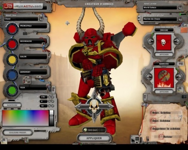 En sus du choix de la race, vous aurez le grand plaisir de personnaliser votre race fétiche sur mesure. En effet, si vous aussi avez pleuré en regardant votre commandeur Space Wolf, peint pendant plusieurs soirées par vos petits doigts boudinés avec amour et dévotion, dans l’espoir incroyable d’en faire le joyau de votre armée, voir de dégoûter votre ami et rival de toujours Bobby le voisin d’en face, quand vous feuilletiez White Dwarf (l’infâme et indispensable mensuel de Games Workshop, vendu tout simplement une petite fortune et qui n’est en plus qu’un catalogue de vente…). Et là dans White Dwarf, vous tombiez sur votre commander peint par le ô combien vénéré (mais maudit tout de même) Mike McVey (passé depuis chez Wizard)…McVey l’homme qui vous fait d’une simple figurine de plomb un véritable miracle de la peinture, un Michael Ange miniature, cet homme connaît tous les secrets sur le brossage à sec, le lavis ou encore le glacis… Bref cette période maudite est terminée !!!! Hop, je sélectionne mes eldars et, rehop, je change leur couleur de fond, la couleur secondaire, les décorations, etc… Tout cela se fait très simplement et un simple choix dans une gamme de couleurs très variée permet d’obtenir la couleur voulue. A vous de trouver un mélange de couleurs efficace et surtout de bon goût ! On note aussi que l’on peut changer le blason porté par les unités et la bannière. Dommage qu’on ne puisse pas ajouter les siennes pour le moment mais nul doute que cette possibilité sera offerte par la suite (des répertoires "badges" et "banners" présents l’attestent).