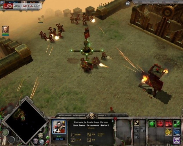 Les unités justement parlons-en ! Elles fonctionnent selon le bon vieux principe de pierre-papier-ciseaux. Aucune unité n’est donc invulnérable mis à part une unité unique sur laquelle je reviendrai plus tard. Ici, toutes les unités piétonnes, les troopers, sont fabriquées en escouade. Et c’est l’une des caractéristiques du jeu là encore. En effet une escouade, même composée de 8 soldats ne peut compter que pour 1 ou 2 hommes dans le compteur des troupes limitées à 20. Ensuite chaque escouade est personnalisable comme dans le jeu de plateau : je rajoute un sergent, je mets une arme lourde à celui-ci (un fuseur), une autre à celui-là (un lance-flammes). Ce sont ces customisations qui donnent tout son sel au jeu car cela permet réellement de renverser une situation, et une escouade en théorie peu encline au combat lourd peut y faire face. On retrouve cette customisation sur certains véhicules, ce qui permet d’obtenir des combinaisons plus efficaces selon l’adversaire. Parmi les unités, certaines ne fonctionnent pas en escouade et sont uniques ou presque sur le terrain : les médics sont produits un à un, les psykers également (troupes disposant de pouvoirs magiques) et surtout les héros sont véritablement uniques. Ces derniers sont, comme dans Warcraft 3, véritablement plus forts et disposent de coups et pouvoirs uniques. Tous ces héros ou unités uniques peuvent être ajoutés à une escouade et font, par la suite, intégralement partie d’elle avec la possibilité de les retirer à tout moment. Cette unité sortant de la sacro règle de pierre-papier-ciseaux et polyvalente, est réellement monstrueuse et l’ennemi aura véritablement du mal à en venir à bout, mais là encore c’est toujours possible. En sus de leurs points de vie, les unités disposent d’une barre de moral. Quand celle-ci atteint un seuil critique (par de lourdes pertes, par l’apparition d’un ennemi imposant), vos troupes se démoralisent et prennent alors la fuite ou encore se mettent à tirer de manière complètement aléatoire et assez inefficace. Pour palier à ce genre de problème, un sergent dans une escouade renforce son moral et dispose même d’un pouvoir pour rappeler ses troupes à l’ordre. Les champions viennent aussi jouer ce rôle et disposent d’une sphère d’influence assez vaste autour d’eux pour en faire bénéficier plusieurs unités. Cette forte influence du moral est vraiment un plus car si certaines races peuvent jouer la carte du surnombre (les orcs notamment), ils payent généralement cette différence par un faible moral. C’est d’ailleurs un des points forts du jeu de plateau qui a été ici repris.