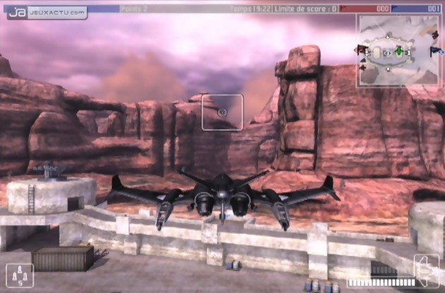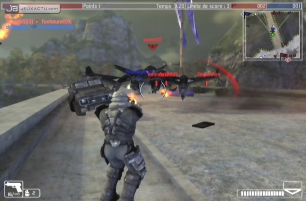 Fort heureusement, Warhawk tire toute sa force grâce à son action trépidante et à un choix relativement varié de véhicules en tout genre. Jeeps, tanks, tourelles de défense, engins volants (Warhawk et Némésis) ou bien à pieds, peu importe le moyen de déplacement, le joueur est opérationnel pour faire la guerre au voisin. Compte-tenu de la taille assez démesurée des cartes, ce sont les deux véhicules aériens qui sont immédiatement pris d’assaut par les joueurs. D’aspect différent, le Warhawk et le Némésis présente en réalité les mêmes fonctionnalités en matière de maniabilité, seuls le type d’armes changent. Grâce à leurs commandes avancées, ce sont évidemment les appareils les plus complets, capables aussi bien de venir en renfort envers d’autres unités, que de lancer un assaut en solo à la base ennemie. Leur comportement et la maniabilité des avions étant très souple, le joueur est capable d’esquiver la moindre attaque sans trop de difficulté. Le stick analogique droit permet en effet à l’engin de réaliser des figures aériennes assez impressionnantes, permettant par la même occasion d’échapper à un missile, même à tête chercheuse. Autre distinction de ces engins volants : ils ont la faculté de passer en vol stationnaire en appuyant sur le bouton Triangle. Cela permet ainsi par exemple d’éliminer des fantassins qui auraient tendance à rester camper au même endroit, ou bien alors faire le ménage dans le QG de l’ennemi, pendant que ce dernier est en vadrouille sur la carte. Plutôt poilant.