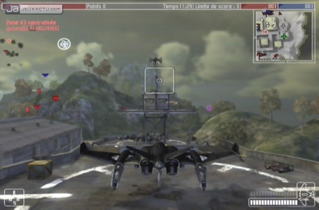Fort heureusement, Warhawk tire toute sa force grâce à son action trépidante et à un choix relativement varié de véhicules en tout genre. Jeeps, tanks, tourelles de défense, engins volants (Warhawk et Némésis) ou bien à pieds, peu importe le moyen de déplacement, le joueur est opérationnel pour faire la guerre au voisin. Compte-tenu de la taille assez démesurée des cartes, ce sont les deux véhicules aériens qui sont immédiatement pris d’assaut par les joueurs. D’aspect différent, le Warhawk et le Némésis présente en réalité les mêmes fonctionnalités en matière de maniabilité, seuls le type d’armes changent. Grâce à leurs commandes avancées, ce sont évidemment les appareils les plus complets, capables aussi bien de venir en renfort envers d’autres unités, que de lancer un assaut en solo à la base ennemie. Leur comportement et la maniabilité des avions étant très souple, le joueur est capable d’esquiver la moindre attaque sans trop de difficulté. Le stick analogique droit permet en effet à l’engin de réaliser des figures aériennes assez impressionnantes, permettant par la même occasion d’échapper à un missile, même à tête chercheuse. Autre distinction de ces engins volants : ils ont la faculté de passer en vol stationnaire en appuyant sur le bouton Triangle. Cela permet ainsi par exemple d’éliminer des fantassins qui auraient tendance à rester camper au même endroit, ou bien alors faire le ménage dans le QG de l’ennemi, pendant que ce dernier est en vadrouille sur la carte. Plutôt poilant.