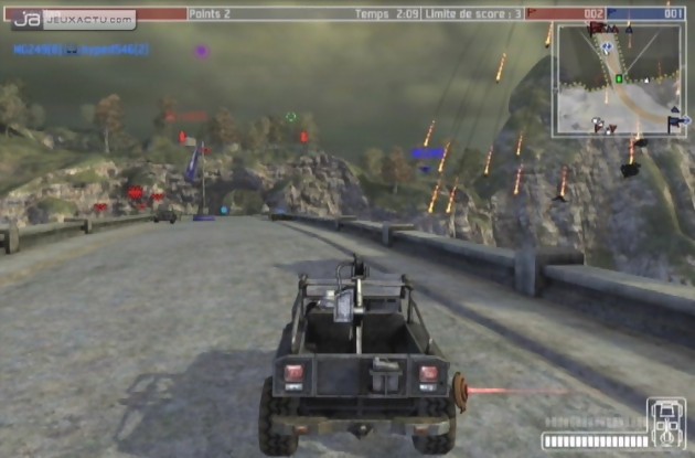 Ce qui l’est moins en revanche, ce sont les fantassins. Jouissant d’une animation assez risibles, les soldats dans Warhawk ont bien évidemment du mal à faire le poids face aux autres engins. Certes, ils disposent de tout un attirail qui leur permettent de se défendre bec et ongles, mais il est assez rare de sortir vainqueur d’un affrontement face à un Warhawk ou une tourelle de défense, qui utilisent des armes bien plus performantes. C’est pourquoi, il est assez utile d’unir ses forces pour attaquer à plusieurs. Et pour cela, la jeep est l’engin adéquat pour accueillir plusieurs soldats. Capable de transporter jusqu’à trois fantassins, la jeep est un véhicule tout-terrain qui compense son blindage léger grâce à une sa vitesse. Malheureusement, il est conseillé d’être au moins deux soldats pour pouvoir l’utiliser correctement, la conduite et le tir à la mitraillette n’étant pas possible en solo. Dans la même veine, le char permet aussi à deux soldats de jouer en tandem. Evidemment lent, ce dernier se montre féroce pour percer les lignes ennemies et détruire rapidement les appareils aériens en plein vol. Afin de dynamiser l’action, des items sont posés un peu partout sur la map, afin de recharger ses munitions et éviter de se retrouver avec comme seule arme un simple couteau. Mieux, certains bonus permettent de réparer son appareil et ce, même en plein vol.