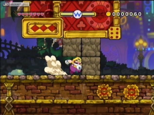 A l’instar de ses premières apparitions sur Game Boy, Wario peut donner un coup d’épaule, soit pour casser des briques et autres pierres, soit pour éliminer un ennemi qui aurait tendance à lui barrer le chemin. Il peut aussi écraser ses opposants d’un simple coup de popotin. Lorsqu’ils sont étourdis ou assommés, les ennemis peuvent être secoués comme de vieux sacs à patates, tout comme ces sacs de bourses disséminés un peu partout dans les niveaux. Il ne faudra d’ailleurs pas trop les snober, ni même les petites pièces en bronze et encore moins les gros diamants. Plus Wario disposera d’un gros compte en banque, plus il pourra continuer son parcours, les cartes pour révéler de nouveaux mondes étant payants ! Gagner plus pour jouer plus, voilà une devise qui semble vraiment d’actualité en ces temps de crise financière. Mais la gamme de coups de notre héros ne s’arrête pas là. En secouant la Wiimote de haut en bas, le joueur peut obliger Wario à faire trembler le sol de son poing ravageur. Cela permet de renverser certains ennemis qui paraissaient invincibles, mais aussi de faire apparaître des niveaux cachés mais surtout de faire tomber certains blocs instables. Acrobate à ses heures perdues, Wario peut aussi se balancer sur une barre fixe ou jouer les Tarzan sur une liane ou une corde de fortune. Histoire de varier encore plus le gameplay, il est possible d’enfourcher des engins tels que le cyclochaudron ou le sous-warin qui offre une jouabilité différente et qui joue sur les fonctionnalités gyroscopiques de la Wiimote. Sympathique.