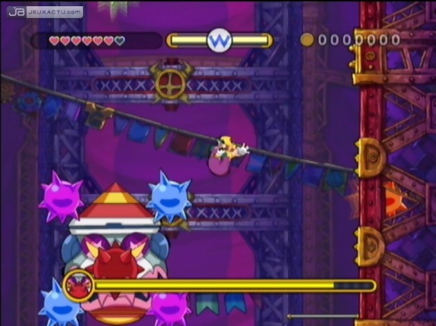 Si cette réalisation est un exemple à suivre, le gameplay et l’utilisation de la Wiimote devraient également servir de tuteur à d’autres titres qui voient le jour sur Wii. Plate-forme 2D oblige, Wario Land : The Shake Dimension se doit de suivre quelques codes bien établis afin de ne pas trahir sa propre condition. Ce n’est pas une surprise et encore moins une surprise que la progression se fait principalement dans le sens de lecture, de la gauche vers la droite. Un scrolling horizontal avec lequel les joueurs trentenaires ont grandi dans les années 80 et 90, et qui parvient toujours à faire son petit effet. Pour mener à bien sa mission, Wario dispose de ses propres capacités physiques, c’est-à-dire pas grand-chose dans l’absolu. Mais grâce à ses grosses fesses et à son abdomen imposant, notre héros est capable de renvoyer le plus cruel des Boss dans sa dimension. La Wiimote tenue à l’horizontale, le joueur peut faire faire à Wario toutes sortes d’acrobaties improbables.