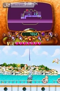 La reconnaissance tactile est l'autre point noir du jeu. En effet, il n'est pas rare de devoir répéter la manoeuvre pour que le symbole soit bien pris en compte. L'inverse est également valable. En Wario Artiste par exemple, un losange peut matérialiser un bloc alors qu'il faut lutter des heures pour créer un coeur, même en y mettant toute sa santé. Idem lorsque l'on souhaite changer de costume, l'imbroglio dragon-matelot est arrivé plus d'une fois. L'instinct reprend parfois le dessus, et il faut reconnaître que dans le feu de l'action - notamment contre les boss - on gratte maladroitement hors de Wario, alors que c'est la règle n°1 du processus. Graphiquement, Wario : Master of Disguise ne casse pas des briques. Si le moustachu obèse possède quelques animations fines et détaillées lorsqu'il change de sape, il en est pas de même pour les monstres qui s'apparentent plus à des sprites basiques. Pas de scrolling différentiel, ni même d'effets pyrotechniques, on nage en plein cours élémentaire. Bon allez, on a quand même craqué pour l'un des thèmes principaux du jeu, celui où Wario et Cannelloni s'échangent quelques vannes bien senties. C'est aussi ce qui sauve un peu Master of Disguise de la déroute totale, un humour pas très fin mais suffisamment light pour être digeste. Une fois terminé, on peut toujours améliorer ses stats en revisitant les niveaux avec tous les déguisements en sac. Mouais.