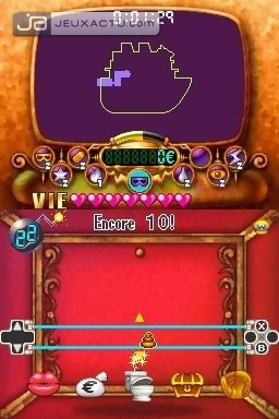 Vous l'aurez compris, le concept de Wario : Master of Disguise repose essentiellement sur les différents costumes que peut endosser notre ami, chacun d'eux renfermant des pouvoirs bien spécifiques. Et pour corser un peu plus la chose, il faudra d'abord dessiner un petit symbole avant de l'enfiler, à condition d'avoir mis la main sur la gemme correspondante. Dans ces cas-là, le tutorial n'est jamais de trop pour mémoriser les pictogrammes à exécuter. Un petit cercle au dessus de la tête et hop, voici Wario transformé en cosmonaute avec son rayon laser. Un triangle qui pointe vers l'arrière comme une queue, et le voilà en dragon cracheur de feu. Une loupe de scientifique, et Wario se change en savant fou capable de révéler les objets invisibles. Chaque métamorphose est bien évidemment évolutive par le biais de master gems qui améliorent sensiblement les capacités. En artiste peintre de niveau 2 par exemple, Wario peut créer jusqu'à trois blocs d'affilée, et même des coeurs pour soigner sa jauge de vie. La découverte des différents costumes se fait à vitesse grand V, ce qui brise un peu l'intérêt du jeu puisqu'on dispose déjà de sept déguisements à la fin du quatrième chapitre. On en chope même deux d'un coup - Wario Foudre et Wario Matelot - dans le troisième. Pas futé sur le coup.