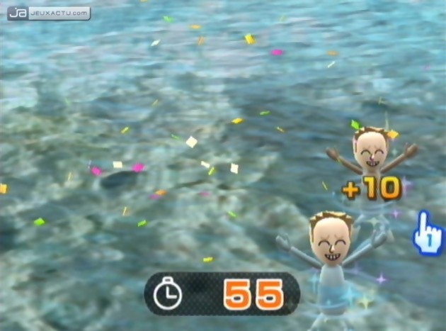 Tout aussi fun et encore plus ludique, le jeu du "où est Charlie" (ou plutôt "où est le Mii") est certainement l’épreuve sur laquelle nous avons passé le plus clair de notre temps dans Wii Play. L’objectif est simple : réussir en un temps record les missions qui sont affichés en début de partie. Retrouver 2 sosies, retrouver son Mii, découvrir le Mii le plus rapide, débusquer le Mii bizarre (celui qui ne fait pas comme les autres), on se pique rapidement au jeu, d’autant que la mise en scène minimaliste est le plus souvent réussi, puisque réalisée sur le ton de l’humour. Le joueur doit donc faire preuve de concentration et de rapidité pour être le premier à trouver le ou les personnages cachés. Parmi les jeux les plus amusants et toujours aussi ludiques, on peut citer le mini-jeu numéro 4. A l’aide de son Mii, l’astuce consiste ici à copier la pose qui s’affiche à l’écran via une petite bulle de savon, le tout sur fond d’images nature ou psychédéliques. Il faut à la fois prendre en compte la position du Mii mais aussi de sa silhouette. Là aussi, plus on enchaîne les niveaux et plus la difficulté augmente, si bien qu’à la fin, c’est un déluge de petites bulles qui défilent à l’écran avant de nous noyer complètement. Dans un autre registre, il y a le billard avec lequel on passera également du bon temps. La Wiimote remplaçant virtuellement la queue de billard, le joueur doit alors doser la force de sa frappe pour réussir à rentrer les bonnes boules dans les bons trous, sans y voir une quelconque métaphore lubrique. C’est amusant comme cette course de vache qui nous permet de maintenant la Wiimote à l’horizontale et de diriger ces bipèdes au comportement un peu lourdaud.