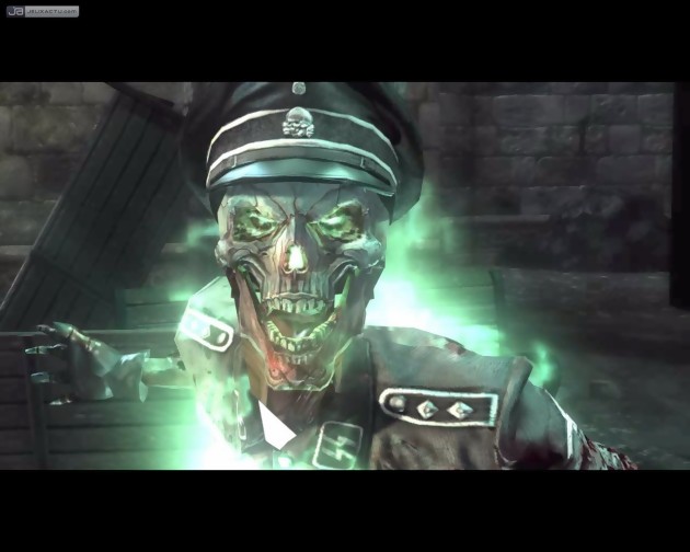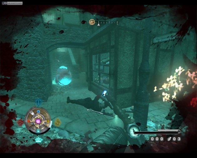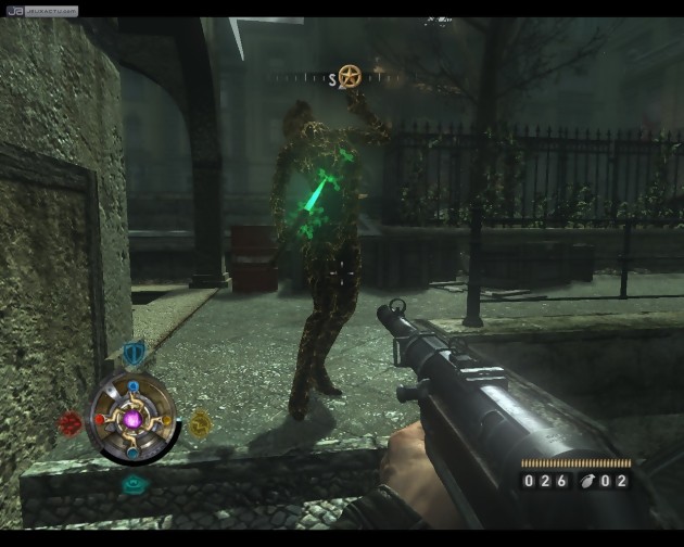Qui dit Wolfenstein, dit savoureux mélange entre Troisième Reich et sciences occultes. Ce nouvel épisode n'échappe pas à la règle et nous propose donc une bonne ambiance de série B, où se côtoient méchants nazis et hideux démons. En tant que soldat des services secrets britanniques, votre rôle consiste bien entendu à éliminer tant les uns que les autres. En revanche il n'est plus permis de détruire tous les symboles nazis que l'on croise sur son chemin (portraits d'Hitler, affiches de propagande, drapeaux à Svastika...) comme on avait coutume de le faire dans l'épisode précédent. Cette régression anecdotique, mais tout de même bien réelle, se voit heureusement largement compensée par une nouveauté de taille : le héros ne se contente plus d'affronter le surnaturel, il sait également en tirer profit. Un antique médaillon trouvé sur un chantier de fouilles lui octroie de puissants pouvoirs. Le premier d'entre eux permet de basculer instantanément dans "le voile", une dimension parallèle à la nôtre grâce à laquelle on voit les choses sous un autre angle. Cette vision alternative de la réalité, représentée à l'écran par des couleurs bleutées, rend phosphorescents les ennemis, les bidons explosifs et quelques autres éléments clés, qui deviennent donc facilement repérables, même dans le noir. De plus, on se rend compte que l'atmosphère qu'on croyait vide de toute présence quelques instants plus tôt est en vérité peuplée de créatures volantes peu ragoutantes. Tant qu'on ne les cherche pas trop, ces dernières ne sont heureusement guère offensives. A l'occasion, on se permettra donc d'en abattre quelques unes afin de générer des arcs électriques susceptibles de blesser les ennemis alentours. Le voile permet également de découvrir quelques passages secrets dissimulés dans des murs pourtant bien solides. Tous ces avantages restent de mise avec les autres pouvoirs qui, en contrepartie, consomment beaucoup plus rapidement l'énergie du médaillon. Il faut dire que du bouclier énergétique au ralentissement du temps, en passant par l'ultra-puissance, ils offrent des avantages presque indécents.