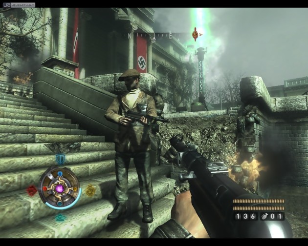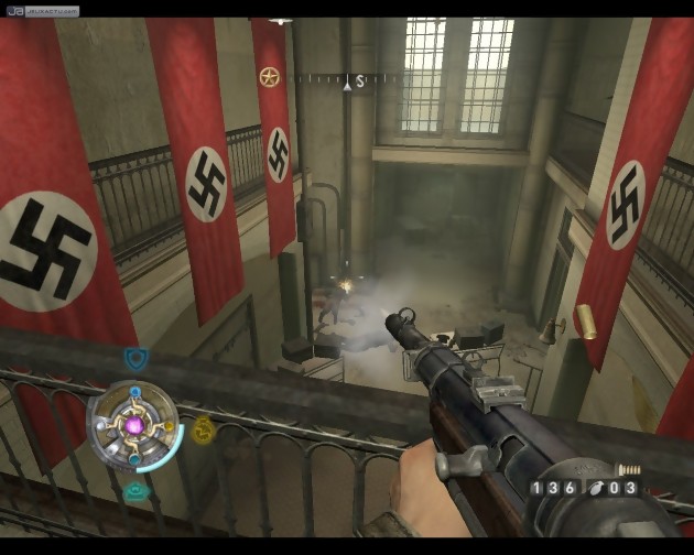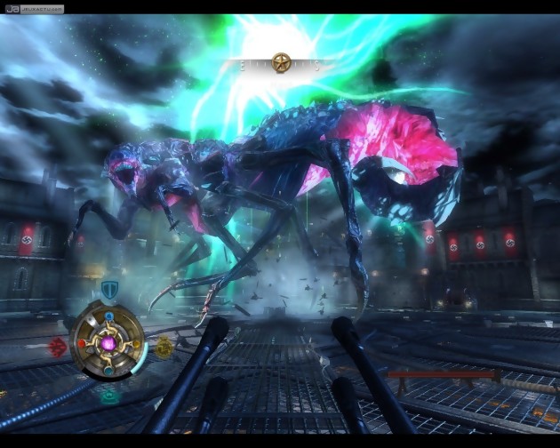 Qui dit Wolfenstein, dit savoureux mélange entre Troisième Reich et sciences occultes. Ce nouvel épisode n'échappe pas à la règle et nous propose donc une bonne ambiance de série B, où se côtoient méchants nazis et hideux démons. En tant que soldat des services secrets britanniques, votre rôle consiste bien entendu à éliminer tant les uns que les autres. En revanche il n'est plus permis de détruire tous les symboles nazis que l'on croise sur son chemin (portraits d'Hitler, affiches de propagande, drapeaux à Svastika...) comme on avait coutume de le faire dans l'épisode précédent. Cette régression anecdotique, mais tout de même bien réelle, se voit heureusement largement compensée par une nouveauté de taille : le héros ne se contente plus d'affronter le surnaturel, il sait également en tirer profit. Un antique médaillon trouvé sur un chantier de fouilles lui octroie de puissants pouvoirs. Le premier d'entre eux permet de basculer instantanément dans "le voile", une dimension parallèle à la nôtre grâce à laquelle on voit les choses sous un autre angle. Cette vision alternative de la réalité, représentée à l'écran par des couleurs bleutées, rend phosphorescents les ennemis, les bidons explosifs et quelques autres éléments clés, qui deviennent donc facilement repérables, même dans le noir. De plus, on se rend compte que l'atmosphère qu'on croyait vide de toute présence quelques instants plus tôt est en vérité peuplée de créatures volantes peu ragoutantes. Tant qu'on ne les cherche pas trop, ces dernières ne sont heureusement guère offensives. A l'occasion, on se permettra donc d'en abattre quelques unes afin de générer des arcs électriques susceptibles de blesser les ennemis alentours. Le voile permet également de découvrir quelques passages secrets dissimulés dans des murs pourtant bien solides. Tous ces avantages restent de mise avec les autres pouvoirs qui, en contrepartie, consomment beaucoup plus rapidement l'énergie du médaillon. Il faut dire que du bouclier énergétique au ralentissement du temps, en passant par l'ultra-puissance, ils offrent des avantages presque indécents.