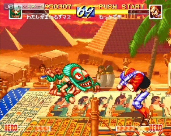 A l’instar de Street Fighter II à son époque, le premier World Heroes proposait un habillage un peu cheap et un contenu famélique. En 1992, les exigences des joueurs n’étaient pas les mêmes et fort heureusement d’ailleurs. Au menu des réjouissances, huit combattants prenaient place sur la grille de départ : Hanzô, Fûma, Dragon, Jeanne, Muscle Power, Rasputin, Brocken et enfin J-Carn. Chacun d’entre eux possède un style de combat bien distinct, à l’exception des deux frères ennemis que sont Hanzô et Fûma, qui pratiquent le même art martial. La ressemblance entre Ryu et Ken est évidemment frappante et encore moins anodine puisque ADK s’est tout simplement contenter de piller les idées chez Capcom. Les autres auront reconnu en Brocken une version robotisée de Dhalsim tandis que Muscle Power est l’équivalent américain de Zangief. Pas étonnant alors de voir des coups spéciaux hérités eux aussi de Street Fighter II avec des boules de feu à gogo, quelques Dragon Punch et des prises qui flairent le plagiat à plein nez. Malheureusement, pour briller aux côtés de l’excellent jeu de baston de Capcom, il aurait fallu que l’équipe de développement d’ADK reprenne à la lettre les mécanismes de jeu de Street Fighter II également. Manque de chance, c’est à partir de ce moment là que le facteur talent entre en jeu et ADK est loin de faire jeu égal avec la firme d’Osaka.
