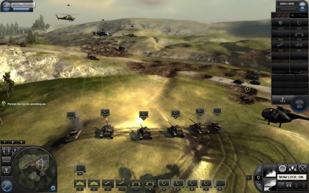 World in Conflict ne s'embarrasse pas de détails. La guerre, c'est pas pour les chochottes, et les meilleurs assauts sont ceux qui impliquent une poignée de tanks lourds et quelques batteries d'artillerie qui pilonnent à distance les positions ennemies. La composition de votre armée est assez sommaire, puisque vous ne pouvez piocher que dans 20 unités différentes... et avez intérêt à le faire avec bon sens. L'aspect de micro-management inhérent au genre est en effet ici partiellement absent, puisque vous ne pouvez construire de base ou entraîner directement vos hommes, qui sont parachutés par l'aviation. Ces demandes vous coûtent toutefois des points de renfort, que vous obtenez en prenant et en fortifiant différents points de contrôle répartis sur chaque carte. Bonne nouvelle, dès que vous perdez un groupe d'hommes ou un véhicule, les points de renfort qu'ils vous ont coûtés vous sont réattribués, et vous ne serez pas contraint à l'abandon à la première erreur tactique. Vous ne serez toutefois jamais largement pourvu en points, et votre groupe d'attaque ne dépassera pas, du moins durant la campagne solo, la quinzaine d'unités. Ce système de points a le grand mérite de vous inciter à aller sans arrêt de l'avant, à vous pousser vers l'ennemi. S'il est toujours possible de camper, le flot a priori intarissable des blindés et unités soviétiques, qui vous harcèlent tant que vous n'avez pas pris une position-clé, vous contraindra à aller au-devant des ennuis. Pour accentuer ce sentiment d'urgence, bien des missions du mode solo sont chronométrées, et la plupart des objectifs secondaires doivent être complétés rapidement. Extrêmement nerveuse, l'action perd du coup beaucoup en finesse.