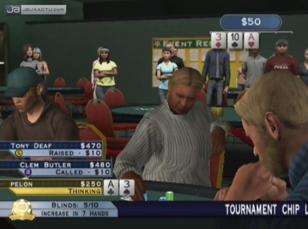 Etant donné le grand nombre de jeux de poker et plus particulièrement de Texas Hold’em à voir le jour mensuellement, on passera rapidement sur la gestion de l’intelligence artificielle de World Series of Poker : Tournament of Champions 2007 Edition durant les tournois du World Series of Poker, les invitations spéciales ou les têtes à têtes télévisés, pour la simple est bonne raison qu'on a toujours un doute sur la crédibilité de l’ordinateur qui connaît forcément votre jeu vu qu’il est à la fois le croupier, l’adversaire et votre conseiller (ici Chris Ferguson). Trois degrés de difficulté vous sont proposés mais pour plus de challenges, mieux vaut se tourner vers les modes multijoueurs uniquement jouables en ligne où l’art du bluff prend tout son sens. Mais concentrons-nous essentiellement sur la réalisation générale de ce World Series of Poker : Tournament of Champions 2007 Edition développé comme l’an passé par Left Field Productions. A vrai dire, la team n’a guère changé de recette pouvant ainsi espérer séduire tant les novices, grâce à une notice suffisamment explicative sur les différents poker existants, que les Patrick Bruel habitués aux tournois longs d’une dizaine d’heures. Mieux vaut être patient lorsque vous jouez à WSP : Tournament of Champions car les adversaires prennent le temps de réfléchir, d’agir et de réagir en fonction de vos mises. Et même lorsqu’on se retrouve nez à nez avec des grands champions tels que Tom "Captain" Franklin, Joe Hachem, Scotty Nguyen ou encore face à Jen Tilly, ça de quoi nous chauffer les oreilles que de devoir patienter 20 à 30 secondes sur chaque participant. Quant la table compte huit amateurs de poker, on fait rapidement un détour par les options espérant pouvant accélérer le rythme du jeu. Effectivement on peut mais les 3 vitesses de réflexion sont mal étudiées. Tantôt trop lentes, tantôt ultra-rapide qu’on n’a pas le temps d’apprécier le jeu ni la gestuelle et les mimiques des personnages qui sont devenues caractéristiques des grands joueurs de texas hold’em. Si l’animation amusera les téléspectateurs de RTL 9 ou de Direct Poker, on ne peut pas en dire autant de la réalisation graphique de World Series of Poker : Tournament of Champions 2007 Edition. Le jeu, déjà pas fameux en 2006, a pris encore quelques rides et a même le toupet de s’offrir de multiples bugs d’affichage lorsqu’on accélère le rythme quasiment soporifique des parties. A propos de rythme, ce n’est pas non plus l’ambiance sonore qui relèvera le niveau avec des commentateurs narcoleptiques et des réactions du public inappropriées.