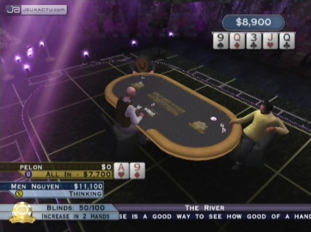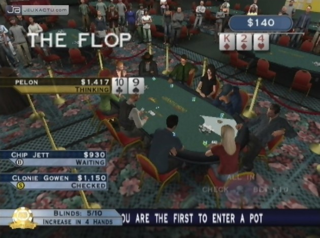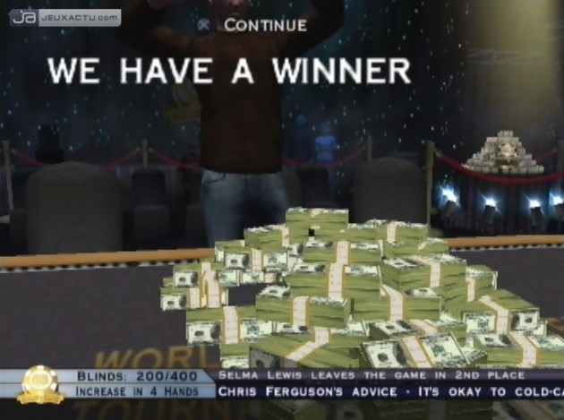 Etant donné le grand nombre de jeux de poker et plus particulièrement de Texas Hold’em à voir le jour mensuellement, on passera rapidement sur la gestion de l’intelligence artificielle de World Series of Poker : Tournament of Champions 2007 Edition durant les tournois du World Series of Poker, les invitations spéciales ou les têtes à têtes télévisés, pour la simple est bonne raison qu'on a toujours un doute sur la crédibilité de l’ordinateur qui connaît forcément votre jeu vu qu’il est à la fois le croupier, l’adversaire et votre conseiller (ici Chris Ferguson). Trois degrés de difficulté vous sont proposés mais pour plus de challenges, mieux vaut se tourner vers les modes multijoueurs uniquement jouables en ligne où l’art du bluff prend tout son sens. Mais concentrons-nous essentiellement sur la réalisation générale de ce World Series of Poker : Tournament of Champions 2007 Edition développé comme l’an passé par Left Field Productions. A vrai dire, la team n’a guère changé de recette pouvant ainsi espérer séduire tant les novices, grâce à une notice suffisamment explicative sur les différents poker existants, que les Patrick Bruel habitués aux tournois longs d’une dizaine d’heures. Mieux vaut être patient lorsque vous jouez à WSP : Tournament of Champions car les adversaires prennent le temps de réfléchir, d’agir et de réagir en fonction de vos mises. Et même lorsqu’on se retrouve nez à nez avec des grands champions tels que Tom "Captain" Franklin, Joe Hachem, Scotty Nguyen ou encore face à Jen Tilly, ça de quoi nous chauffer les oreilles que de devoir patienter 20 à 30 secondes sur chaque participant. Quant la table compte huit amateurs de poker, on fait rapidement un détour par les options espérant pouvant accélérer le rythme du jeu. Effectivement on peut mais les 3 vitesses de réflexion sont mal étudiées. Tantôt trop lentes, tantôt ultra-rapide qu’on n’a pas le temps d’apprécier le jeu ni la gestuelle et les mimiques des personnages qui sont devenues caractéristiques des grands joueurs de texas hold’em. Si l’animation amusera les téléspectateurs de RTL 9 ou de Direct Poker, on ne peut pas en dire autant de la réalisation graphique de World Series of Poker : Tournament of Champions 2007 Edition. Le jeu, déjà pas fameux en 2006, a pris encore quelques rides et a même le toupet de s’offrir de multiples bugs d’affichage lorsqu’on accélère le rythme quasiment soporifique des parties. A propos de rythme, ce n’est pas non plus l’ambiance sonore qui relèvera le niveau avec des commentateurs narcoleptiques et des réactions du public inappropriées.