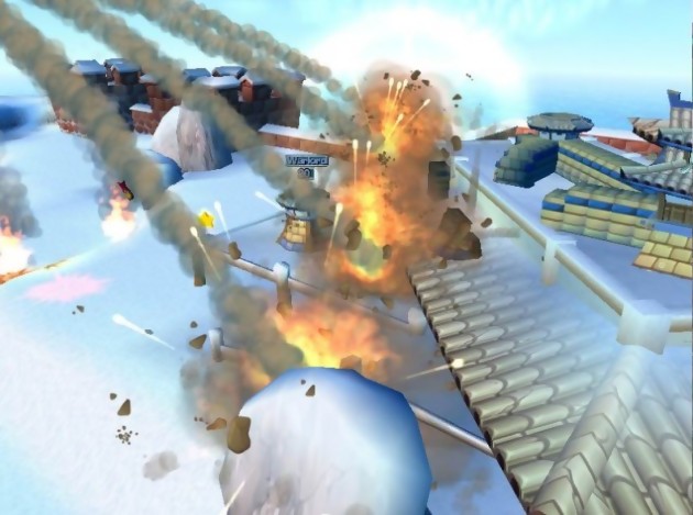 On prend donc le temps de construire sa cité, et les premiers tours se montrent donc très passifs. On s’observe et on avance doucement. C’est bien là le défaut du jeu, les parties sont bien longues (il n’est pas rare de passer près de trois-quarts d’heure sur un seul niveau) et l’action tarde à se manifester. Une fois les deux tribus suffisamment proches l’une de l’autre, le carnage peut enfin commencer. On délaissera alors rapidement les attaques classiques des premiers volets de la série pour atteindre le toit de ses structures et chercher le point faible dans la cité opposée. En effet, chaque bâtiment construit crée des liaisons avec les bâtiments voisins, et par ces chaînes, chaque ouvrage se voit lié directement ou indirectement à votre QG. En détruisant une liaison unique avec le reste des bâtiments encore liés aux QG, le ou les constructions isolées se voient alors intégralement détruites. A vous donc d’assurer des liaisons multiples et de réparer vos points sensibles pour éviter qu’une réaction en chaîne ne viennent décimer votre civilisation. Si toutefois vous êtes épris de folie pacifique, sachez qu’il existe une troisième solution de connaître la victoire, comme nous l’annoncions au début de ce test. En prenant possession de points stratégiques suffisants sur la carte, une nouvelle construction apparaît dans vos possibilités : la Merveille. Ce bâtiment totalement inoffensif et relativement fragile sert à exhiber votre suprématie. Soyez le seul à disposer d’une Merveille, et assurez sa survie pendant deux tours consécutifs, et les autres tribus ne pourront que s’agenouiller devant vous. Mais ne soyons pas trop idéaliste, la destruction du QG reste et restera la méthode la plus courue, comme sûrement la plus jouissive. Pour ne pas se perdre dans ce lot de nouveautés, on retrouve le traditionnel menu, spécialement revu pour l’occasion. Simple, clair, efficace, on accède rapidement aux outils demandés et sans confusion. Un double double-saut fait également son apparition pour vous permettre d’atteindre des points plus élevés tels que les toits de vos plus puissantes structures, et la caméra, sans être idéale, est déjà plus souple que dans Worms 3D. Si le jeu se révèle bien différent sur de nombreux points, la prise en main reste la même, et manier nos vers devenus fins stratèges reste particulièrement plaisant.