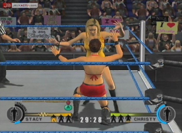 Les graphismes du jeu exploitent réellement les capacités de la GameCube (NDMaxime : t'as pas dû jouer à Resident Evil 4 alors...) avec un soin apporté à la modélisation des catcheurs et une définition des prises de lutte vraiment proche de la réalité. La jouabilité est instinctive et on prend vraiment son pied à déplacer son lutteur et à lui faire effectuer toutes les prises possibles avec une rapidité d’exécution d’enfer. Si au début d’un match, on domine facilement son adversaire avec une certaine facilité à encaisser les coups puis à se relever, la difficulté ira crescendo au fil du temps et il faudra taporterr comme un malade sur les touches pour se donner une chance de s’en sortir. Avec son mode scénario et ses nombreux lutteurs ainsi que les différents styles de combat possibles, la durée de vie est donc conséquente surtout si on se donne la peine de trouver quelques fans de catch qui viendront participer au pugilat avec la possibilité d’organiser des matchs jusqu'à 4 joueurs en même temps sur le ring. Le seul vrai point noir du jeu réside dans au niveau de la bande son, notamment de la qualité parfois médiocre des musiques qui viennent entacher les parties surtout lorsque l’on est coincé entre les cordes. Il est également dommage de constater l'absence des voix des lutteurs pendant les phases "back stages", qui auraient apporté un coté convivial supplémentaire. Par contre, on ne peut que s’incliner devant les entrées toujours spectaculaires des lutteurs (NDMaxime : ridicules tu veux dire non ?), identiques à la réalité avec les musiques officielles des catcheurs mais aussi les jeux de lumière et autres feux d’artifices qui les accompagnent.