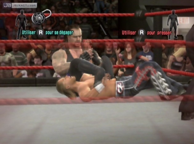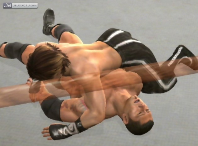 Au-delà de cet aspect purement technique, WWE Smackdown VS Raw 2009 featuring ECW s’en sort plutôt bien côté gameplay. Il n’a d’ailleurs pas trop changé depuis l’année dernière et l’utilisation du stick analogique droit pour gérer les attaques offre une prise en main assez rapide et efficace. Pour ceux qui prennent le train en marche, sachez qu’en pointant une direction avec le stick en question, le catcheur réalise des attaques ou des prises bien distinctes, qui diffèrent d’ailleurs en fonction de la position de l’adversaire. Si l’on prend un malin plaisir à martyriser autrui lorsqu’il gît au sol, il est conseillé de lui infliger quelques belles mandales pour lui faire flancher les genoux. Pour cela, les quatre boutons de la manette sont idéals pour mettre à mal son opposant. Evidemment, il est possible de contrer ses coups, mais il faut être doté de bons réflexes puisqu’il faut appuyer sur les touches prévues à cet effet au moment où l’assaillant porte son coup. On peut ainsi renverser une situation et prendre l’ascendant. Quoi qu’il arrive, dans WWE Smackdown VS Raw 2009 featuring ECW, tout a été bâti pour que le joueur, casual comme initié, parvienne à prendre son pied rapidement et à profiter du spectacle. Pour ce faire, les développeurs ont pensé à varier les plans, et il n’est pas rare en plein match de voir les coups qu’on inflige sous différents points de vue. Non seulement, cela permet de dynamiser l’action mais en plus, certains focus offrent la possibilité de contempler les expressions des catcheurs, toujours prompt à faire la grimace à la moindre pichenette reçue.