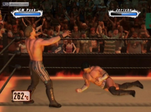 Si la série WWE Smackdown VS Raw n’avait pas à craindre la concurrence jusqu’à présent, elle doit aujourd’hui composer avec la présence de TNA iMPACT! sorti quelques mois plus tôt sur PlayStation 3 et Xbox 360. Si ce dernier s’est montré assez satisfaisant dans son ensemble, il lui manquait encore quelques arguments pour faire vaciller le roi de son trône. Mais la paresse des développeurs de Yuke’s Co, qui se contentent depuis quelques numéros de mettre à jour la base de données, prouve bien que la franchise WWE Smackdown VS Raw peut basculer d’un jour à l’autre. Car on a beau lui trouver nombre de qualités, WWE Smackdown VS Raw 2009 featuring ECW n’hésite pas à faire étals de ses lacunes. Graphiquement tout d’abord, le moteur graphique utilisé commence sérieusement à montrer ses faiblesses. Si de manière globale, la modélisation des catcheurs est assez réussie, on déplore des textures assez pauvres, recyclées depuis maintenant près de deux ans. Le jeu ne nécessite pourtant pas de grandes prouesses techniques compte-tenu de la faible quantité de personnages à animer en même temps. Il y a bien évidemment le public dans le stade à faire bouger mais ce dernier fait parti des détails les moins prestigieux du jeu. Silhouettes cubiques, animations répétitives et identiques d’un perso à un autre, tapisserie dans le fond vraiment vilaine, on est loin, très loin du rendu que peut nous offrir un NBA 2K9 par exemple. L’animation des catcheurs fait elle aussi peine à voir, et on a beau la pointer du doigt à chaque review, les développeurs semblent sourds à nos appels. Beaucoup de soucis techniques qu’on espère corriger pour l’opus suivant, surtout si THQ a vraiment envie de garder sa couronne ; la concurrence étant aujourd’hui très rude.