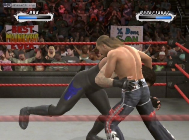 Si la série WWE Smackdown VS Raw n’avait pas à craindre la concurrence jusqu’à présent, elle doit aujourd’hui composer avec la présence de TNA iMPACT! sorti quelques mois plus tôt sur PlayStation 3 et Xbox 360. Si ce dernier s’est montré assez satisfaisant dans son ensemble, il lui manquait encore quelques arguments pour faire vaciller le roi de son trône. Mais la paresse des développeurs de Yuke’s Co, qui se contentent depuis quelques numéros de mettre à jour la base de données, prouve bien que la franchise WWE Smackdown VS Raw peut basculer d’un jour à l’autre. Car on a beau lui trouver nombre de qualités, WWE Smackdown VS Raw 2009 featuring ECW n’hésite pas à faire étals de ses lacunes. Graphiquement tout d’abord, le moteur graphique utilisé commence sérieusement à montrer ses faiblesses. Si de manière globale, la modélisation des catcheurs est assez réussie, on déplore des textures assez pauvres, recyclées depuis maintenant près de deux ans. Le jeu ne nécessite pourtant pas de grandes prouesses techniques compte-tenu de la faible quantité de personnages à animer en même temps. Il y a bien évidemment le public dans le stade à faire bouger mais ce dernier fait parti des détails les moins prestigieux du jeu. Silhouettes cubiques, animations répétitives et identiques d’un perso à un autre, tapisserie dans le fond vraiment vilaine, on est loin, très loin du rendu que peut nous offrir un NBA 2K9 par exemple. L’animation des catcheurs fait elle aussi peine à voir, et on a beau la pointer du doigt à chaque review, les développeurs semblent sourds à nos appels. Beaucoup de soucis techniques qu’on espère corriger pour l’opus suivant, surtout si THQ a vraiment envie de garder sa couronne ; la concurrence étant aujourd’hui très rude.