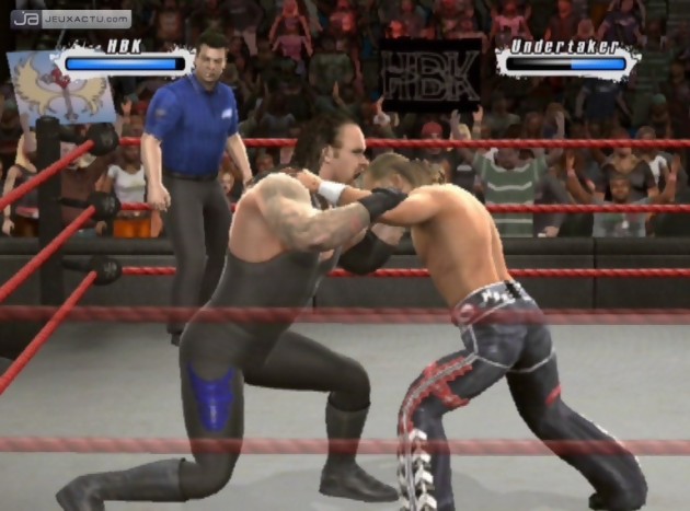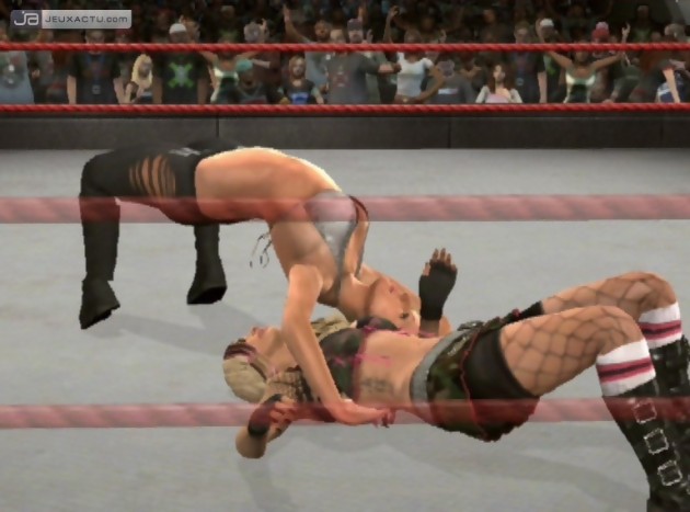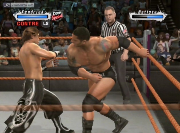Si la série WWE Smackdown VS Raw n’avait pas à craindre la concurrence jusqu’à présent, elle doit aujourd’hui composer avec la présence de TNA iMPACT! sorti quelques mois plus tôt sur PlayStation 3 et Xbox 360. Si ce dernier s’est montré assez satisfaisant dans son ensemble, il lui manquait encore quelques arguments pour faire vaciller le roi de son trône. Mais la paresse des développeurs de Yuke’s Co, qui se contentent depuis quelques numéros de mettre à jour la base de données, prouve bien que la franchise WWE Smackdown VS Raw peut basculer d’un jour à l’autre. Car on a beau lui trouver nombre de qualités, WWE Smackdown VS Raw 2009 featuring ECW n’hésite pas à faire étals de ses lacunes. Graphiquement tout d’abord, le moteur graphique utilisé commence sérieusement à montrer ses faiblesses. Si de manière globale, la modélisation des catcheurs est assez réussie, on déplore des textures assez pauvres, recyclées depuis maintenant près de deux ans. Le jeu ne nécessite pourtant pas de grandes prouesses techniques compte-tenu de la faible quantité de personnages à animer en même temps. Il y a bien évidemment le public dans le stade à faire bouger mais ce dernier fait parti des détails les moins prestigieux du jeu. Silhouettes cubiques, animations répétitives et identiques d’un perso à un autre, tapisserie dans le fond vraiment vilaine, on est loin, très loin du rendu que peut nous offrir un NBA 2K9 par exemple. L’animation des catcheurs fait elle aussi peine à voir, et on a beau la pointer du doigt à chaque review, les développeurs semblent sourds à nos appels. Beaucoup de soucis techniques qu’on espère corriger pour l’opus suivant, surtout si THQ a vraiment envie de garder sa couronne ; la concurrence étant aujourd’hui très rude.