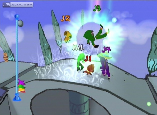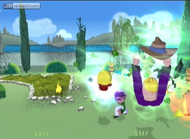 Si le jeu démarre sur un combat légendaire entre un puissant maître en arts martiaux et une sorcière aux pouvoirs démoniaques, le scénario de Xiaolin Showdown est certainement l’aspect sur lequel on s’attardera le moins, quand bien même les amateurs du dessin animé retrouveront Omi et ses trois compères, Kimiko, Raymondo et Clay, chargés de protéger des objets sacrés et faire ainsi régner le Bien sur la terre. Une histoire somme toute classique donc mais qui a le mérite de suivre à la lettre celle de la série animée. Reprenant le concept des jeux de combat à plusieurs façon Super Smash Bros. Melee ou Kung Fu Chaos, Xiaolin Showdown permet à 4 joueurs de s’affronter sur une arène fermée. Si en mode solo, le but est d’éliminer les ennemis envoyés par le méchant Jack Spicer à l’aide de ses amis contrôlés au choix par un ou plusieurs camarades ou le CPU, l’objectif diffère quelque peu lorsqu’on passe au mode "Showdown", l’équivalent d’un mode multijoueur. Chaque zone de combat est ponctuée par la présence d’objets et divers items avec lesquels le joueur peut interagir. Jarres, orbes de pouvoirs, boules de santé, on nage en terrain connu, ce qui n’est pas forcément un atout majeur pour un challenger qui tente désespérément de se démarquer de l’ombre des grands. Ce n’est peut-être pas l’intérêt voulu mais toujours est-il que les arènes pu inspirés n’aident pas Xiaolin Showdown à proposer un univers captivant. Côté combats, le nombre de coups et autres attaques s’avèrent bien trop limités pour varier les plaisirs et le manque de précision dans les coups ne fait qu’accentuer le sentiment de frustration pour un titre s’adressant à un jeune public. Reste alors une réalisation correcte et fidèle au dessin animé, grâce notamment à l’utilisation du cel-shading, bien qu’on aurait aimé un peu plus de variété et d’originalité dans les niveaux proposés.