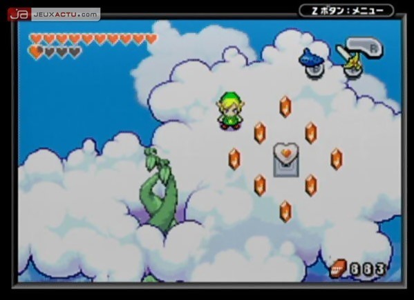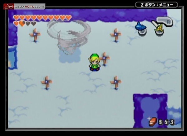 En plus de vous permettre de vous transformer en Minish, Exelo, servira également de deltaplane d’urgence et sera une aide précieuse lorsque vous serez bloqué dans votre aventure. Un chapeau, c’est bien, mais que serait Link sans son attirail de Mc Gyver ? En dehors des traditionnels boucliers, épées, boomerang, torches, bombes, bottes de Pégase, ocarina et autres arcs, on découvre quelques gadgets totalement nouveaux. Le premier d’entre eux est un vase magique qui vous permet d’aspirer les ennemis ou les poussières et de les rejeter contre un mur. Idéal pour démunir certains ennemis d’une carapace un peu trop solide. Le second objet est le Bâton Sauteur, un bâton qui permet de retourner certains objets et notamment des vases dans lesquels il sera ensuite possible de se transformer en Minish. Viennent ensuite les Griffes de Taupe, qui, comme leur nom l’indique, permettront à Link de creuser comme une taupe dans certaines cavernes. Enfin, dernière nouveauté, la Cape du Roc, qui permettra à Link de sauter et de planer quelques secondes. Indispensables pour sauter par-dessus des petits précipices. Rajoutons à tout cela les fameux flacons dans lesquels on peut enfermer des fées ou mettre des potions ainsi que les palmes pour nager et vous aurez un aperçu complet de l’inventaire de Link.