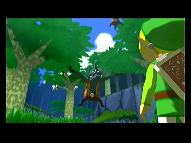 Pour commencer ce manque, Zelda nous offre l’univers le plus grand qu’il nous ait été donné de parcourir avec Link. Exit Epona pour faire vos longs trajets et visiter les 49 îles présentes, mais un voilier et qui parle en plus ! Equipé de bombes ou de la corde, vous pourrez même transformer votre voilier en véritable navire de combat. Toujours dans un souci de renouvellement, exit ici les Kokiri, les Gorons et les Zoras qui peuplent d’ordinaire le paisible royaume d’Hyrule, place désormais aux Rito, une sympathique tribu d’oiseaux postiers, et aux Koroks, fidèles du légendaire arbre Deku. Ce qui n’a guère changer avec ce The Legend of Zelda : The Wind Waker, c’est la panoplie de gadgets mis à disposition, le grappin, le boomerang, les bombes, l’arc etc. Il y a aussi quelques nouveautés comme la corde, l’appareil photo, la longue-vue et la feuille Deku qui permet de planer un certain temps dans le sens du vent. En deux ans, Link a également appris de nouvelles capacités comme la furtivité, digne d’un Metal Gear Solid, la navigation mais aussi un tas de nouvelles techniques de comabt pour vaincre les monstres les plus coriaces. Une petiet technique sympa permet de rouler autour de l’ennemi locké et de l’attaquer par derrière, juste au moment où il s’apprête à vous attaquer. Les combats n’en sont plus qu’animés et c’est franchement agréable.
