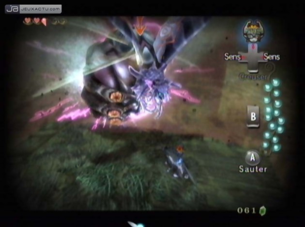 Les échos vers Shadow of The Colossus ne s’arrêtent pas en si bon chemin. Tout comme ces colosses qu’il a fallu abattre, parfois contre notre gré, les différents Boss de The Legend of Zelda : Twilight Princess se décomposent dans un nuage épais noir et se libèrent du Mal qui les possédait. Ce renvoi sans cesse au monde du Crépuscule fait du pied à un autre chef d’œuvre, paru très récemment sur PlayStation 2 : Okami. Tout un chacun le sait désormais, la tragédie de Link - berger de nature mais tatoué par la Triforce - est d’être l’élu, celui qui pourra chasser les forces du Crépuscule et de redonner les couleurs au monde d’Hyrule. Recolorer un monde fait de noirs et de blancs à travers les traits d’un loup, voilà un véritable hommage à Clover Studio, décédé prématurément mais que son Okami restera à jamais graver dans notre cœur. C’est donc à l’aide de Midona, une créature mi-figue mi-raison à cause de ses intentions floues, que Link va pouvoir rendre aux différentes parties d’Hyrule ses couleurs resplendissantes. Pas de peur à avoir, Link métamorphosé en loup se manie de la même façon que le Link original, à quelques détails près. Sa condition d’animal lui permet de courir plus rapidement mais aussi d’accéder à de nouvelles fonctions. Ainsi, grâce aux pouvoirs conférés par Midona, notre jeune loup peut emprisonner des esprits malins dans un cercle avant de les achever d’une seule attaque percutante. Une transformation réussie donc pour The Legend of Zelda : Twilight Princess qui permet au joueur de jongler d’un corps à un autre de manière parcimonieuse.