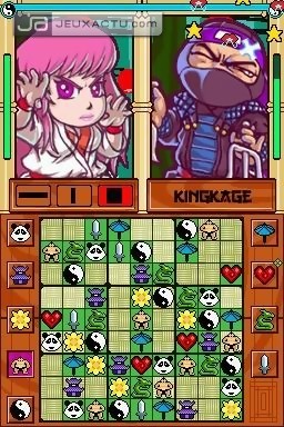 Dès l’allumage de la console, on sent que Zoonami s’est investi. Contrairement à l’austérité caractéristique des essais précédents, la première chose qui nous saute ici aux yeux est la qualité de l’habillage. Les développeurs ont créé un univers nippon, kawaii tout plein autour de leur concept de Zendoku. Un petit background a ainsi été créé avec ses personnages et leurs propres histoires. Limité, mais sympa. Ici fini les chiffres, place à de petits symboles qu’il faudra correctement placer dans des grilles classiques de Sudoku. D'autres softs du même genre avaient déjà tenté de faire varier le principe de base avec des divers dessins. Mais si les règles restent les mêmes, il ne s’agit pas là d’un simple maquillage destinant à nous tromper. Tout le concept du Zendoku tourne autour d’un système de duel où chaque ligne, colonne, carré de 3 sur 3 ou série de symboles complétés enverra à l’adversaire une attaque, qui se traduira par un mini-jeu dont il devra s’acquitter pour poursuivre sa grille. Loin d’être insignifiant, ce système vous permet de voir sur une barre dédiée le type d’attaque et le moment où vous serez frappé. Vous ne serez cependant pas une passive victime de tout ce manège car il est possible de se renvoyer les attaques. Un système de combo est présent afin d’enquiquiner davantage l’adversaire avec une attaque plus puissante. DS oblige, ces mini-jeux exploitent intelligemment les spécificités de la machine. Il faut, à la manière d’un WarioWare Touched, jouer du stylet et de votre souffle pour revenir à l’objectif principal. Peu variés, ils amèneront tout de même un peu plus de tension cassant la monotonie d’une partie de Sudoku classique, renforçant par là même le sentiment de compétition. Joueurs solitaires, les quêtes principales sauront vous tenir en haleine un bon moment, avec des persos supplémentaire à débloquer. Vous pourrez également vous exercer aux mini jeux. D’anecdotiques modes contre la montre et zen sont disponibles, puisqu’il s’agira réellement pour le coup d’un Sudoku déguisé. Encore plus inutile quand on sait qu’un mode Sudoku classique est présent.