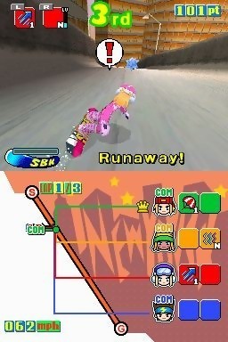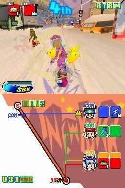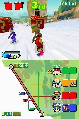 Après deux opus sur Nintendo 64, Atlus a décidé d’offrir à la nouvelle console portable de Big N une adaptation 100% tactile de Snowboard Kids. Rebaptisé pour l’occasion SBK : Snowboard Kids DS, le jeu est une fusion de Cool Boarders et de Mario Kart. Ainsi donc tricks et items seront de la partie afin d’intensifier les descentes. Et pour encore plus de fun, les développeurs ont inclus un mode multijoueur jouable jusqu’à 4 avec une seule cartouche. Le rendez-vous avec la poudreuse est fixé au 1er novembre 2005 pour les joueurs américains. L’Europe devra patienter encore un peu.