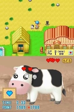 Après quelques illustrations durant l’E3, Nintendo poursuit sur sa lancée avec des nouvelles images de Harvest Moon DS. Et si le nombre d’épisodes ne cesse de grandir, chaque volet arrive toujours autant à passionner. Et pour cet opus tactile, le premier sur DS, Nintendo compte bien utiliser un maximum l’écran inférieur de la console notamment lorsqu’il s’agit de s’occuper des animaux qui peuplent votre ferme (moutons, poules, chevaux, chiens, canards, chats et vaches). Outre les travaux de récolte et d’élevage, vous pourrez vous distraire grâce aux nombreuses activités du village et pourquoi pas débloquer quelques bonus sympathiques en connectant Harvest Moon : Friends of Mineral Town dans le port GBA de la console portable.