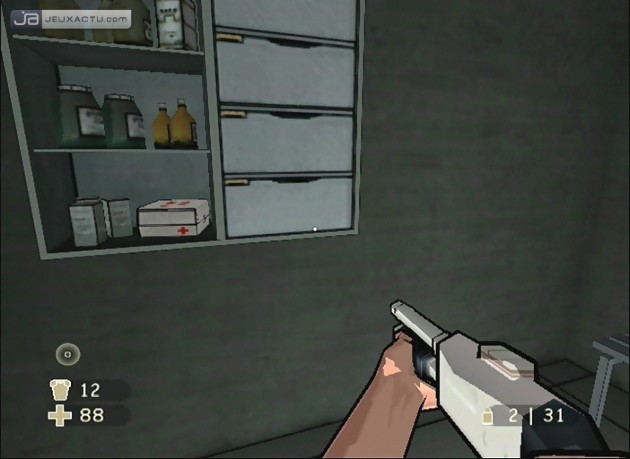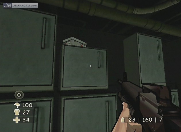 Là aussi il va falloir rester discret pour ne pas éveiller les soupçons des GI. Débutez la mission par vous saisir des balais. Ouvrez la porte pour neutraliser le premier GI qui vous tourne le dos. Dans le couloir, attrapez la chaise et assommez le militaire suivant. Au moindre coup de feu, les autres GI donneront l’alerte alors restez vigilant et soyez rapide dans vos mouvements. Prenez la chaise qui se présente à vous pour aller la fracasser contre le GI posté devant la double porte verrouillée. Saisissez la chaise et entrez dans l’armurerie où un autre militaire fait sa ronde. Neutralisez-le puis ramassez les différentes armes, protection et autres kits de santé. Sortez en pénétrez dans la grande salle de réunion. Prenez par la gauche jusqu’au tomber dans un traquenard. Le Président est pris en otage et vous devez le libérer. Pour ce faire, éliminez tous les boss qui surgissent de partout pour ensuite vous battre contre Standwell. Ce dernier est muni d’un M60. Servez-vous de vos grenades M16 pour le blesser rapidement puis finissez-le avec lui balançant un maximum de rafales de M16 dans la tête. Récupérez la clef menant au Président Galbrain ainsi que son M60. Déverrouillez la porte de la salle de commandes, enclenchez le bouton et prenez le Président avec vous [Photo 152]. Avancez puis tournez à gauche pour arriver dans un couloir à bandes jaunes. Un peu plus loin, vous verrez que Sheridan et ses secrétaires sont aussi retenus en otage. Des Spads vous repèreront et essayeront de vous éliminer. Sauvegardez après le checkpoint, déposez le Président pour ne pas être gêné et éliminez tous les ennemis qui surgiront des deux côtés. Laissez toujours le Président à terre et allez plutôt à droite. Un boss sortira d’une pièce à droite un peu plus loin. Liquidez-le et entrez dans cette pièce pour trouver des grenades sur la table. Sortez, allez à droite au fond du couloir pour accédez aux vestiaires où un ennemi se cache. Tuez-le, récupérez ses munitions et ramassez le gilet par balles et le médikit dans l’armoire à pharmacie accrochée au mur [Photo 153]. Retournez dans le couloir principal pour récupérer le Président et continuez à avancer. Un GI prendra en charge le Président pour vous laisser porter secours à ses compatriotes mal en point. Quelques grenades suffiront pour déloger tous ces Spads. Dans la bataille, évitez les tirs des GI qui risquent de vous blesser. Pénétrez dans le sas pour accéder à la salle des commandes et terminer la mission en beauté.